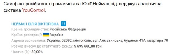 Як пише Главком і публікує скріншоти, “родинні зв’язки фігурантів з Росією підтверджуються, зокрема, наявністю громадянства Нейман, а також тим, що її мати проживає в Нижньовартовську (РФ): “У колі близьких також присутній її колишній чоловік — Данило Гіренко, співробітник ФСБ, з яким Нейман має спільну дитину”.