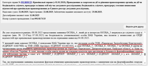 Відповідно до матеріалів розслідування, фірми, які формально мають незначні виробничі можливості та малу кількість працівників, різко збільшили обсяги прибутків після підписання договорів на зведення інженерних укріплень: “За інформацією аналітичної системи, обсяг надходжень на рахунок “ПВК Арсенал” у 2024 році зріс з 1,3 млн грн до понад 5,1 млрд грн у 2025 році”.