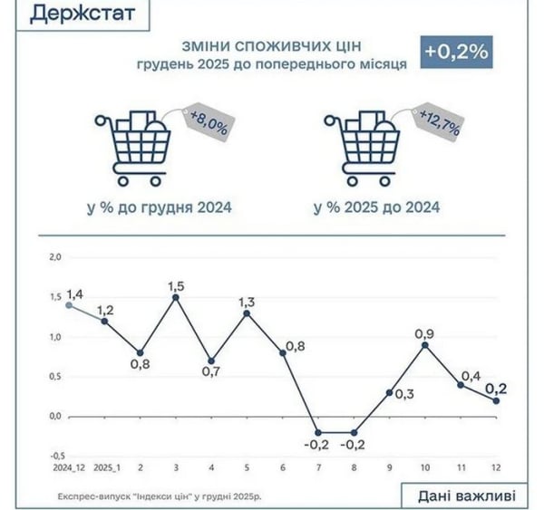 У той же час, за даними офіційної статистики — Державної служби статистики України, базова інфляція з грудня 2024-го по грудень 2025-го була в півтора рази меншою — всього 8%. Загалом за грудень збільшення цін склало лише 0,1%, причому найбільше додали у вартості яйця, хліб, риба, сало, овочі, соняшникова олія — на них вартість зросла від 0,7 до 5,6%. На 0,2−4,1% стали дешевшими фрукти, м’ясо птиці та свинина, цукор, рис і масло вершкове.