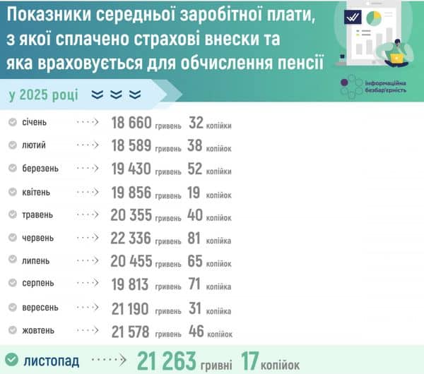 «30 грудня 2025 року було затверджено показник середнього заробітку (прибутку) в Україні, з якого були сплачені внески на страхування та який, відповідно до Закону України „Про загальнообов’язкове державне пенсійне страхування“, враховується для обчислення пенсії, за листопад 2025 року. Він складає 21 263 гривні 17 копійок», — вказано в офіційному повідомленні.