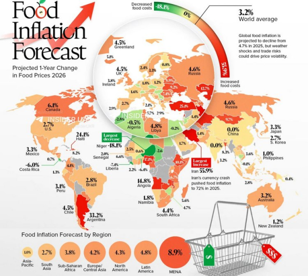 Найвищий рівень зростання цін на продукти харчування очікується в країнах Близького Сходу та Північної Африки — близько 8,9%, тоді як середній світовий показник становить 3,2%. Український показник, що майже втричі перевищує світовий, також належить до найвищих регіональних темпів зростання. Варто зазначити, що у Туреччині прогнозують подорожчання продуктів на 25,1% у 2026 році, що ставить країну на третє місце у світовому рейтингу.