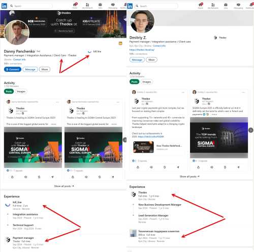 Однак, головний доказ зв’язку двох проектів – загальні кадри. Згідно з профілями на Linkedin, ключові «працівники» Thedex поєднують роботу і в Bill_line. Так, наприклад, Danny Panchenko зазначає, що з 2024 року працює одночасно і в Thedex.cloud, і в Bill_line до сьогодні. Подібну інформацію вказує і певний Dmitriy Z., який з квітня 2024 року займається технічною підтримкою в Bill_line і одночасно є менеджером в Thedex.cloud.