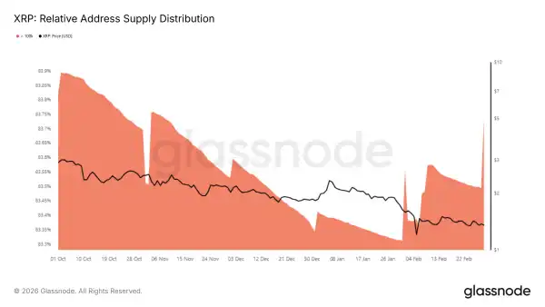 Великі власники XRP, відомі як “кити”, продовжують нарощувати свої позиції, незважаючи на несприятливі ринкові умови. Протягом лютого адреси, що зберігають понад 100 000 монет XRP, помітно збільшили свої загальні резерви. Наразі ці інвестори контролюють 83,7% від загальної кількості випущених XRP.