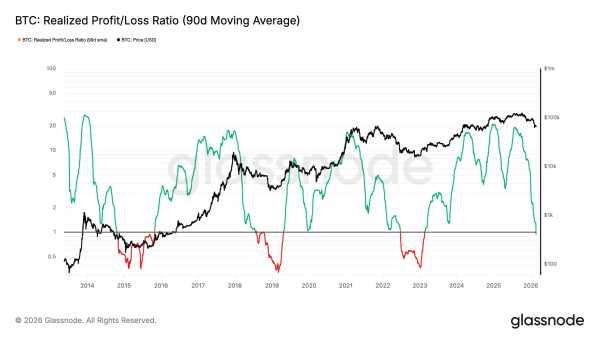 «Співвідношення реалізованого прибутку до збитку (90-денна ковзна середня) наразі нижче 1.0, що підтверджує перехід до фази ринку з надмірними збитками. Зазвичай такі спади тривають понад шість місяців. Відновлення вище цього рівня найчастіше свідчить про повернення ліквідності на ринок», — зазначають у звіті Glassnode.