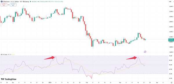 Аналітик під псевдонімом CW розглядає це як позитивний сигнал для продовження бичачого тренду. Він проводить паралелі з 2020 та 2019 роками, коли вартість Ethereum зростала саме після того, як позиції великих інвесторів ставали прибутковими. > “Зони збитків для великих китів зазвичай сигналізують про досягнення дна. Коли вони знову починають фіксувати прибуток, це стає відправною точкою для бичачого тренду”, – зазначив CW. ### Потенційні ризики та індикатори Однак, поспішати з висновками ще зарано. Індикатор відносного сили (RSI) почав демонструвати спадний рух, досягнувши зони перекупленості. Схожа ситуація спостерігалася в січні поточного року, перед значним падінням ціни. Якщо провести аналогію, курс криптовалюти може або різко обвалитися, або почати зниження після ще одного короткочасного зростання.