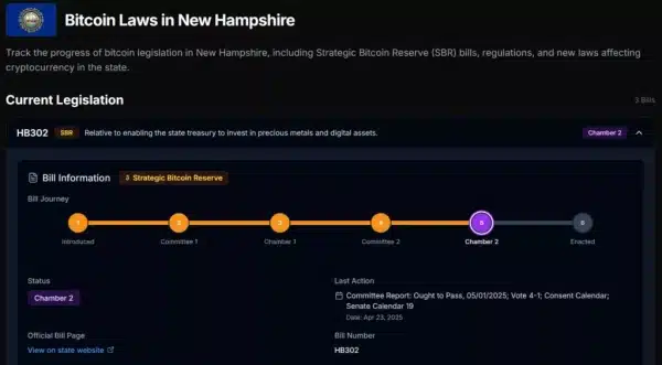 Прогрес у законодавстві щодо резервування біткойнів у Нью-Гемпширі. Джерело: Закони про біткойни.