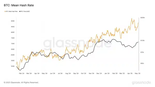 Згідно з даними Glassnode, протягом цього періоду середній хешрейт становив 885,12 EH/s.