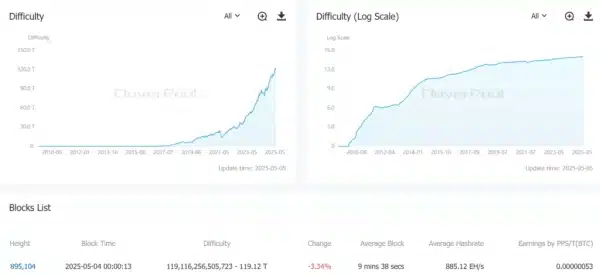 4 травня відбулося чергове коригування рівня складності майнінгу біткойнів, який знизився на 3,34%, довівши показник до 119,18 Т.