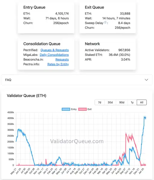 Незважаючи на волатильність курсу, інтерес до стейкінгу Ethereum залишається стабільно високим. За даними ValidatorQueue, черга на стейкінг досягла рекордних 71 дня, а 4 мільйони ETH очікують на зарахування до смарт-контракту.